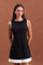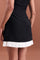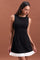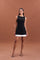 This refined black mini dress redefines modern chic with its clean sleeveless bodice and crisp white pleated hem.